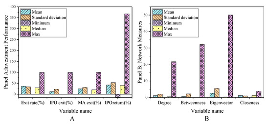 The main variables of the sample interval are exit, network centrality, other characteristics of venture capital institutions, entrepreneurial enterprise characteristics, venture capital market environment, and listed enterprise characteristics. The descriptive statistical results are shown in Figure 2, Figure 3 and Figure 4.