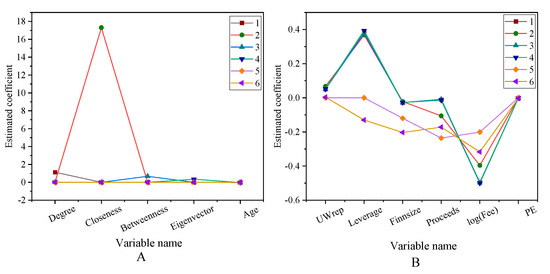 Test results of risk investment social network centrality factors (A) The first five variables. (B) Other variables.