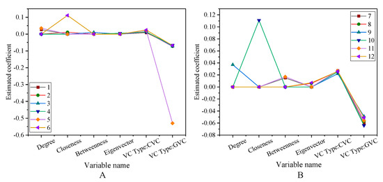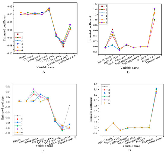 The robustness test is to test the robustness of the successful exit rate of the portfolio. Among them, Figure 12A is the test of the first 6 variables 1–6 items, and Figure 12B is the test of the first 6 variables 7–12 items. Figure 13A is the test result of 1–6 items of other variables, and Figure 13B is the test result of 7–12 items of other variables. The test results show that the significance of all the variables fluctuates between −0.4–0.1. Among them, most of them are concentrated between −0.1–0.1. Using different exit window times or other indicators of reputation agents, the results show significant robustness. The robustness test of the region’s social network and the successful exit rate of the investment portfolio is shown in Figure 14.