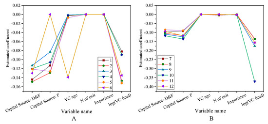 Robustness test for portfolio successful exit rates (A) The first six variables 1–6. (B) The first six variables 7–12.