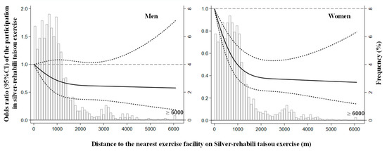 Odds ratio of participation in the silver-rehabili taisou exercise and the distance to a facility in men and women. The solid line represents the odds ratio, and the dashed line represents the 95% confidence intervals. Distance to the nearest exercise facility on silver-rehabili taisou exercise distribution is represented by histograms in the background. Knots were placed at the 10th, 50th, and 90th percentiles of the distance to the exercise facility using <100 m as the reference point. CI = confidence interval.