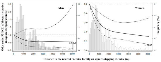 Odds ratio of participation in the square-stepping exercise and distance to a facility in men and women. The solid line represents the odds ratio, and the dashed line represents the 95% confidence intervals. Distance to the nearest exercise facility on square-stepping exercise distribution is represented by histograms in the background. Knots were placed at the 10th, 50th, and 90th percentiles of the distance to the exercise facility using <100 m as the reference point. CI = confidence interval.