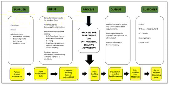 Finally, as a fourth step, the patient’s surgery was then confirmed to the patient by text message. This process was made visible by the use of an LSS SIPOC tool (Figure 2), which facilitates a high-level view of the process [].