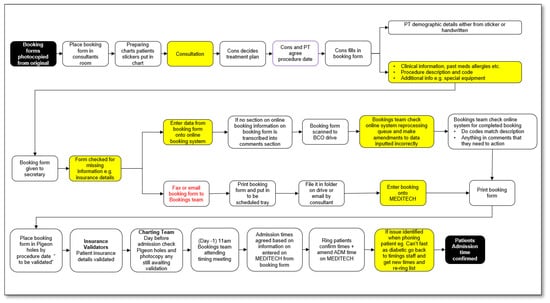 Stakeholder engagement was key to the success of this project. There had been multiple previous attempts at improving both the booking form and scheduling process, with limited success. These unilateral/siloed approaches had resulted in legacy issues, such as multiple versions of the same form, processes that encouraged the duplication of work—for example, moving information from MEDITECH patient records, to paper forms, to an online scheduling app, and back to MEDITECH. LSS has been demonstrated as being effective in bringing teams together to overcome silos [,,,] and in this process improvement our approach to stakeholder engagement ensured that the existing process was scrutinised from all perspectives and that the impact of suggested improvements was considered for all participants—consultants, patient services, and scheduling teams. Whilst patients were a beneficiary, as they received earlier scheduling for surgery, they had no direct impact on the process. Each team member gained an understanding of others’ requirements in order to complete the process. There was also a new understanding that each of these requirements was equally important [].