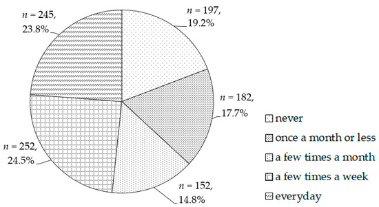 The sample comprised 1028 Taiwanese women aged ≥18 years, nearly 20% of whom had never exercised. Among the participants, 24.5% and 23.8% engaged in exercise lasting at least 20 min and that made them sweat more or breathe more quickly than usual at least a few times a week and every day, respectively (Figure 1). Overall, 497 participants, accounting for 48.3% of the total sample, were determined to have an exercise habit, whereas the remaining 531 participants (51.7%) were not.