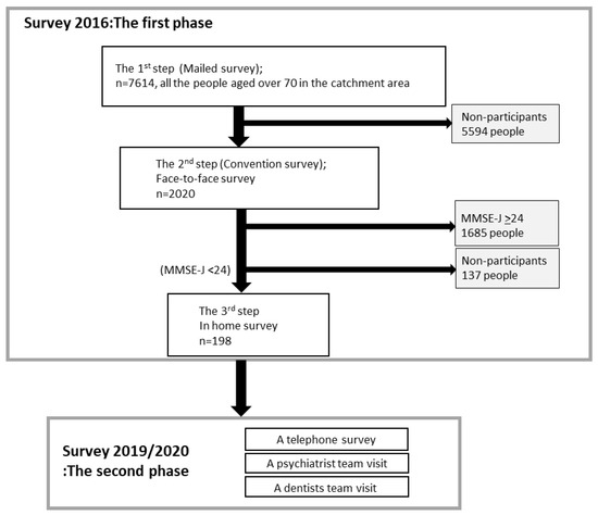 In the first phase, questionnaires were mailed to 7614 residents over 70 years old in the target area of Tokyo, and 5430 were returned. A total of 2020 people then participated in a face-to-face survey that included the Mini Mental State Examination (Japanese version) (MMSE-J). Finally, 198 of the 335 people who scored MMSE-J < 24 were visited by the interdisciplinary team, including a psychiatrist [19].