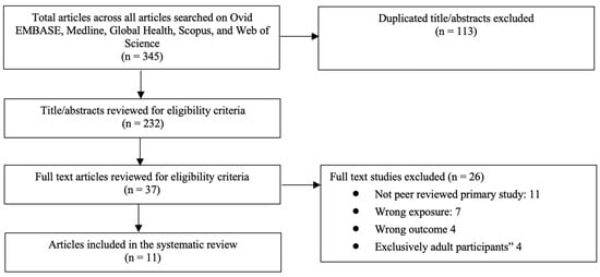 The initial search yielded 345 results. After removing duplicates, 232 titles and abstracts were screened, following which a further 195 articles were excluded as they did not meet the eligibility criteria. Of the remaining 37 articles, which moved on to the full-text screening stage, 11 were included in the systematic review and used for the data extraction and analysis. The PRISMA flow diagram in Figure 1 below illustrates the search results. In total, three cohort studies and eight cross-sectional studies were included. The studies included were published between the years 1990 and 2016. Three studies were conducted in low-income countries, six were conducted in upper-middle-income countries, and one was conducted in a high-income country. Specifically, the included studies took place in Brazil [7], China [8], Ecuador [9], Guatemala [10], Turkey [11], Honduras [12], India [13], Jordan [14], Malaysia [15], Nigeria [16], and Poland [17]. All included studies had a score of ≥6 and were considered high quality based on the Newcastle-Ottawa Scale. A summary of the included studies can be found in Table S4.