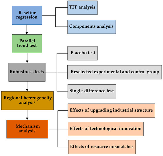 The pilot low-carbon cities provided an appropriate quasi-natural experiment, so they constituted the experimental group while the remaining cities constituted the control group. The DID method was used to analyze the effects of the LCC on TFP and its components. The research framework of this paper is illustrated in Figure 1.