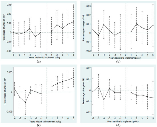 where and are the respective dummy variables in the -th years before and after the policy implementation. We excluded the years of the implementation, estimated the dynamic changes in the differences of the effects of the LCC on TFP between the experimental and control groups in the sample period, and drew the parallel trend test chart shown in Figure 2. Before the establishment of the cities, no significant differences in TFP and its components for both groups were present. After the implementation, the effects and differences gradually appear, thus verifying the parallel trend hypothesis.