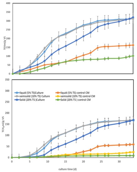 2.6. Effect of the Total Solid Content of CM on Biomethanation Using MS as an Inoculum Source