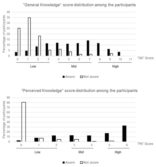 Distribution of general knowledge (GK) and perceived knowledge (PK) scores among the participants who have heard of the project.