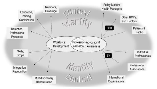 - Naicker, A.S.; Htwe, O.; Tannor, A.Y.; De Groote, W.; Yuliawiratman, B.S.; Naicker, M.S. Facilitators and Barriers to the Rehabilitation Workforce Capacity Building in Low- to Middle-Income Countries. Phys. Med. Rehabil. Clin. N. Am. 2019, 30, 867–877. [Google Scholar] [CrossRef]