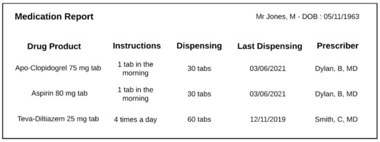 - Barton, A.; Fabry, P.; Ethier, J.-F. A Classification of Instructions in Drug Prescriptions and Pharmacist Documents. In Proceedings of the 10th International Conference on Biomedical Ontology (ICBO 2019), Buffalo, NY, USA, 30 July–2 August 2019; pp. 1–7. [Google Scholar]