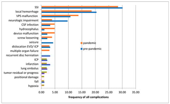 Perioperative complications in the pandemic and pre-pandemic patient group. ICP, intracranial pressure; EVD, external ventricle drainage, CSF, cerebrospinal fluid; VPS, ventriculoperitoneal shunt; SSI, surgical site infections.
