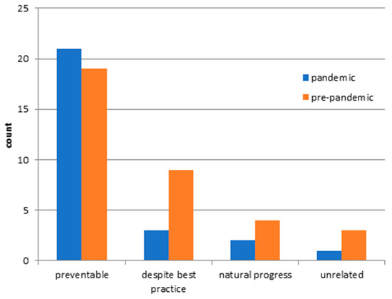 Finally, we examined the unplanned readmissions in both groups. The unplanned readmission rate was 5.05% (27 cases) during the pandemic, while the pre-pandemic readmission rate was 5.81% (35 cases). The detailed reasons for readmissions were without statistical difference for both groups (see Supplementary Table S1). A closer look at the detailed reasons for readmission indicated that SSIs were responsible for most of the unplanned readmissions. There is no significant difference (p-value = 0.390), but there is a trend towards a reduction in the pandemic group (10 cases pre-pandemic vs. 5 cases pandemic). A significant difference between the reasons for readmission was not found. Further factors regarding the unplanned readmission group with patient-related and treatment-dependent factors are shown in Table 3. There were no significant differences for either study group. Furthermore, there were similar frequencies for the pandemic and the pre-pandemic group regarding the causes for readmissions (Figure 3). The surgical causes predominated in both groups. A progress of the underlying disease was responsible for the majority of pre-pandemic unplanned readmissions, whereas new medical complications caused the majority of unplanned readmissions in the pandemic group. In the following, the readmissions were divided into categories (Figure 4). There was no significant difference in readmission categories for either study group. Most unplanned readmissions were for the pandemic and pre-pandemic study group classified as ‘preventable,’ followed by ‘despite best practice’.