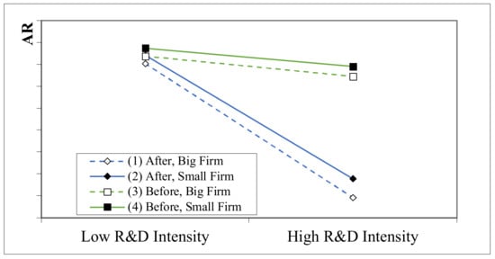 In order to present the moderating role of firm size more vividly, we illustrate the negative impact of high R&D investment intensity on the AR after the “4 + 7” procurement policy for different levels of the firm size. Following the method recommended by Aiken et al. [], we created the image shown in Figure 1. It can be found that the slopes of big firms are steeper, compared with those of small firms, which indicates that high R&D investment intensity has a greater negative impact on big firms after the “4 + 7” procurement policy. The figure also shows that after the implementation of the “4 + 7” procurement policy, the high R&D investment intensity has a greater negative impact on AR caused by the “4 + 7” procurement policy.