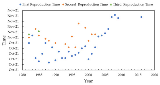 | Characteristic Year | Average Water Temperature in October (°C) | Average Water Temperature in November (°C) | Mean Water Temperature in October of the Characteristic Year (°C) | Mean Water Temperature in November of the Characteristic Year (°C) | Time of First Reproduction | Delay Time (Days) | ||