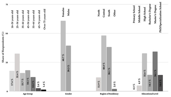 Overall, out of the total 1003 respondents, 60.7% were female and 39.3% male. The largest share of respondents belonged to the age group 25–34 (32.4%), followed by the age groups 45–54 (18.1%), 18–24 (17.6%), 33–44 (15.7%), 55–64 (12.2%), 65–74 (2.6%) and over 75 (1.4%). Figure 1 describes the characteristics of participants.