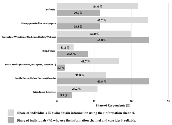 Focusing on the number of individuals who believe the information to be true, journals or websites of medicine, health, wellness, and family doctor/other doctors/chemists were considered the most reliable channels, followed by TV and newspapers or online newspapers. Few individuals seek information from blogs and forums, while the information provided by social media and friends, despite being accessed by many, was generally not reliable for most of the respondents.