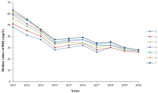 A total of 76,362 children, among whom 43,993 (57.6%) were boys and 32,369 (42.4%) were girls, were included in the study (Table 1). The overall boy to girl ratio was 1.36. The boy to girl ratio in each year were as follows: 1.36 in 2011, 1.37 in 2012, 1.32 in 2013, 1.34 in 2014, 1.30 in 2015, 1.38 in 2016, 1.37 in 2017, 1.31 in 2018, 1.48 in 2019, and 1.41 in 2020. The boy to girl ratios were not significantly different from 2011 to 2018 (χ2 = 6.82, p = 0.448). The boy to girl ratio in 2019 was significantly higher than those in 2011–2018 (χ2 = 16.41, p = 0.037). The average age was 3.3 ± 1.8 years old. The distribution of BLL was positively skewed. The median BLL was 35 μg/L (IQR: 28–47), and the range was 8–963 μg/L. Table 1 represents the BLLs of boys and girls in different years; the median BLL of boys was significantly higher than that of girls (p < 0.05). The median BLLs for different age groups are illustrated in Table 2. The median BLL was lowest (32 μg/L) in the ~1 year group and highest (38 μg/L) in the ~6 and ~7 years groups (p < 0.001). The median BLLs were not significantly different between the ~6 and ~7 years groups (Z = −0.22, p = 0.826). Overall, the median BLLs increased with age in all children. Figure 1 shows the changes in the median BLL of different age groups from 2011 to 2020. The median BLLs in each year are as follows: 55 μg/L (IQR: 44–67) in 2011, 47 μg/L (IQR: 37–60) in 2012, 41 μg/L (IQR: 33–52) in 2013, 33 μg/L (IQR: 27–39) in 2014, 34 μg/L (IQR: 29–41) in 2015, 35 μg/L (IQR: 30–44) in 2016, 30 μg/L (IQR: 26–36) in 2017, 32 μg/L (IQR: 26–40) in 2018, 29 μg/L (IQR: 25–35) in 2019, and 27 μg/L (IQR: 24–31) in 2020.