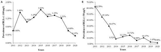 Prevalence of BLLs ≥ 100 μg/L (A) and BLLs ≥ 50 μg/L (B) from 2011 to 2020.