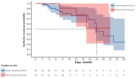 To evaluate treatment efficiency, 73 participants were recruited into two groups. The first included 54 children with high blood lead (100 ≤ BLLs ≤ 199 μg/L), and the second included 19 children with mild lead poisoning (200 ≤ BLLs ≤ 249 μg/L). After a period of oral calcium supplement, the BLLs of the 73 children were retested, which was the basis for us to evaluate treatment efficiency. During the follow-up, 15 children had their BLLs reduced to blow 100 μg/L in the first group, and only three children had their BLLs reduced to blow 100 μg/L in the second group. The shortest time required for an effective treatment in the first and second groups was two and seven months, respectively. The interval from the beginning of treatment to the retesting of BLLs varied in each child, ranging from 1 month to 26 months with a mean of 8.6 months. The result exhibited no statistical difference between the two groups (χ2 = 0.273, p = 0.601). The median time required for an effective treatment was 18 months in the first group. The median time required for an effective treatment was not available in the second group (Figure 3).