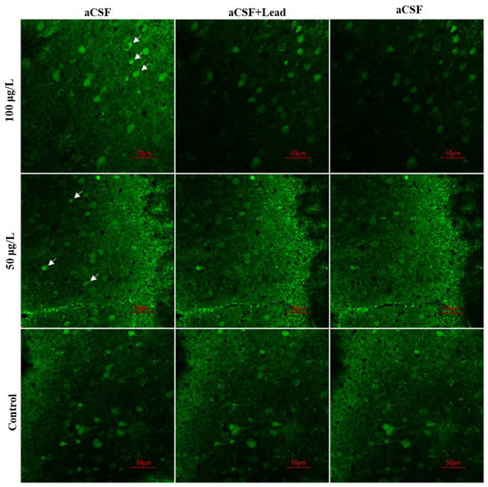 A mechanistic study was performed on mice to further clarify the significant neurotoxicity of lead. Lead not only competes for calcium binding sites but also reduces the level of intracellular calcium [14], which prompted us to measure the acute effects of lead exposure on developing cortical neurons. The Ca2+ stain was used in coronal slices of mice on post-natal day 21. An assessment of the acute effects of lead on neuron Ca2+ signals was achieved via the continuous infusion of lead. Interestingly, we observed that lead exposure led to a gradual and persistent loss of Ca2+ signals in developing cortical neurons. All fluorescent patterns of the excited neurons indicated by the white arrows disappeared. The fluorescent intensity in the 100 μg/L group was lower than that of the 50 μg/L group and control group after lead exposure, and it did not recover even after the aCSF (including CaCl2) was switched back (i.e., the lead exposure was removed) (Figure 4). The change in fluorescence intensity in the 50 μg/L group was not observable. The fluorescent patterns of only a few of the excited neurons indicated by the white arrows disappeared.