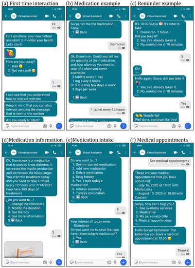 The functionalities developed for this medication adherence study were discussed and designed in collaboration with the nurses from the primary healthcare center Las Fuentes Norte in Zaragoza, Spain, who were in charge of the recruited patients. These functionalities are described in Table 1. The first meetings with the nurses were about what they think will be useful to have in a virtual assistant based on their professional experience monitoring patients. After showing them the prototype, a few more meetings were held in order to improve the chatbot conversation and to obtain the final version of the virtual assistant. The two main functionalities included are “medication option”, where patients can add medication and medication reminders, and “appointment option”, where patients can add an appointment with their healthcare professionals and configure appointment notifications. Medication reminders are sent a maximum of three times per programmed intake. If the patient does not respond to the reminder, another reminder is scheduled with a delay of 10 min. If the patient has not answered after three reminders, the virtual assistant stops reminding the patient and marks the intake as unanswered. Nevertheless, the virtual assistant includes a way for the patient to indicate that despite not answering the reminders, the medication was taken. This is a very useful safeguard because it could be a common situation for the patient not to hear the reminders (thus not answering on time), but taking the medication nevertheless. Thus, as we can observe in Figure 1c,e, the patient can inform the virtual assistant that the medication was taken by two options: either by answering the reminders or by telling the virtual assistant using the medication options menu. In addition, the virtual assistant shows the weather forecast every morning, gives a summary of the adherence every week, and sends links to tutorials on YouTube that explain how to use the virtual assistant. It was included an initial tutorial where the basic usage of the virtual assistant was explained.