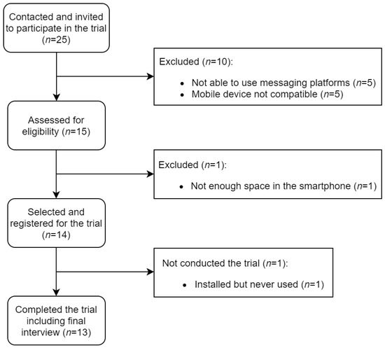 In total, 15 patients completed a baseline assessment for eligibility (as shown in Figure 2). One patient needed to be excluded from the pilot study because the smartphone did not have enough space to install new applications. After selecting and registering the patients for the study, one patient did not interact with the virtual assistant. Finally, a total of 5 healthcare professionals and 13 patients with type 2 diabetes mellitus and depressive disorder participated and completed the study from 9 May 2019 to 9 February 2020. The average age of patients was 63.8 years (SD 9.1) (range 44–83 years) and 69% of them were females (9/13). The patients needed to take an average of five different drugs per day. They also had periodical medical appointments every two or three months with their nurses if needed.