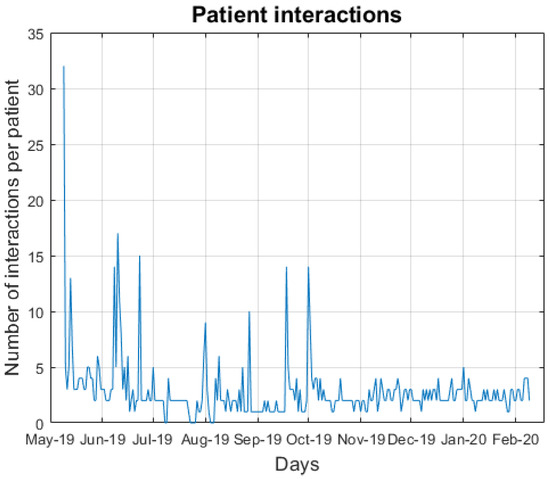 The number of messages sent every day from the user to the virtual assistant (normalized by the number of active patients) is shown in Figure 3. The average number of messages sent per day by a patient was 2.7 (SD 2.9). A significantly high number of interactions can be observed on the first day of the study compared with the rest of the days. This is because all the participants had to take part in an initial tutorial where the basic use was explained. The rest of the peaks during the study mean that one or more patients were exploring the different options of the virtual assistant. In general, most of the patients interacted with the virtual assistant uniformly. A total of 88.5% of the interactions (4278/4835) were made using numeric-based messages, in contrast with 11.5% of text-based messages sent (557/4835).