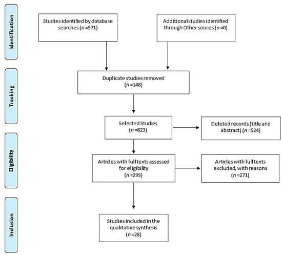 A total of 971 studies were identified; 148 duplicates were excluded: VHL (n = 6), SCOPUS (n = 233), Web of Science (n = 66), PubMed (n = 601), and CINAHL (65). Another 524 were excluded during title and abstract reading, resulting in 299 articles being chosen for full reading, of which 28 met the study inclusion criteria (Figure 1).