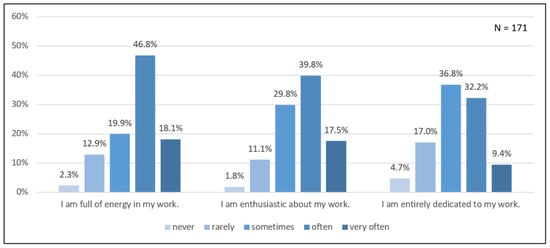 About two-thirds of the participants indicated that they were often or very often full of energy at work (Figure 2). The results for enthusiasm for work were similar, as the majority reported being enthusiastic often or very often. The results for work dedication were lower, with more than half of the participants sometimes, rarely, or never being dedicated at work.