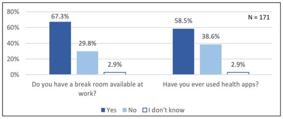 Although detrimental health behaviour among care workers is known [24,25,26,27] and has been attributed to high physical and mental strain [23,28], research about workplace health promotion in outpatient care services is lacking studies on interventions targeted to this specific group. One reason for this could be the overall complex framework conditions [29,30]. Practical starting points for workplace health promotion could be the availability of a break room in the healthcare service [31] or a digital implementation, for example, health apps [19]. However, it is not known how many outpatient caregivers have a break room available and whether they use health apps at all.