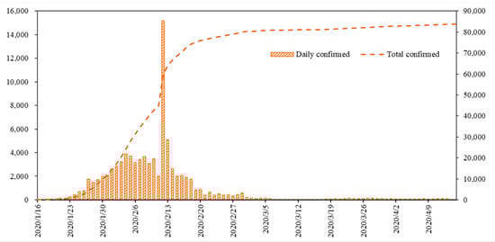 Starting in December 2019, Wuhan, Hubei Province, China reported a series of unexplained cases of pneumonia [,]. On 7 January 2020, through deep sequencing analysis of the patient’s respiratory tract, China identified a new coronavirus (SARS-CoV-2; previously known as 2019-nCoV) as pathogenic bacteria []. Subsequently, COVID-19 quickly spread to other parts of Hubei Province and nationwide, seriously threatening public health [,]. Since 18 January, the epidemic has spread rapidly throughout China due to large-scale migration related to the Chinese New Year. By 29 January, confirmed cases were recorded in all provinces and regions of China [,]. As of 24:00 on 15 April 2020, according to the National Health Commission of the People’s Republic of China, 83,797 cases were reported nationwide. Among them, 67,803 cases and 50,008 cases were diagnosed in Hubei Province and Wuhan City, accounting for 80.91% and 59.68% of the country, respectively. Figure 1 shows the trend of daily confirmed cases. From 16 January to 3 February, the number of daily confirmed cases increased rapidly. From 4 February to 15 April, the number of daily confirmed cases showed a general downward trend. Among them, the number of daily confirmed cases reached 15,153 on 12 February, becoming the day with the largest number of daily confirmed cases. On March 7, the number of daily confirmed cases fell below 100 for the first time. From 7 March, the number of daily confirmed cases is less than 150 and is at a stable level. This shows that China’s battle against the COVID-19 epidemic has achieved significant results.
