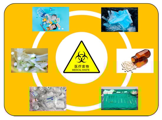 The diagnosis and treatment of COVID-19 patients not only produced conventional medical waste, but also produced contaminated protective clothing, masks, gloves, and other protective equipment []. In addition, there are patients’ household garbage. This has led to a surge in the total amount of medical waste and increased pressure on medical waste disposal. Unlike ordinary wastes and garbage, medical wastes that are untreated or incompletely treated will not only cause environmental pollution, but also directly or indirectly cause infections and endanger people health [,].