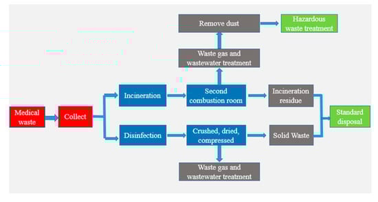 On the other hand, improper disposal of medical waste will also pollute the air and even release harmful gases. When the temperature and the appropriateness reach certain conditions, the organic matter in the medical waste will decompose and produce harmful gases and dust []. The diffusion of these harmful substances into the atmosphere will cause the deterioration of air quality, and, at the same time, endanger public health and ecological balance [,]. At present, China has formed a medical waste centralized treatment technology system focusing on ossification and disinfection []. Table 2 lists the commonly used medical waste treatment technologies and their scope of application in China. Figure 3 illustrates the basic flow of medical waste treatment.