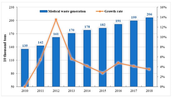 In the process of rapid development of health care in our country, an alarming amount of medical waste is continuously produced. According to data from the National Bureau of Statistics, from 2010 to 2018, the amount of medical waste in China increased from 1.349 million tons to 2.0601 million tons (Figure 4), showing an upward trend year by year. If these medical wastes cannot be strictly and effectively controlled and managed, it is likely to cause environmental pollution and bring huge pressure to global environmental protection [,]. In this case, it is necessary to formulate and implement medical waste disposal laws and regulations. A scientific legal system helps to properly dispose of medical waste without damaging the ecological environment and endangering social security [,]. From Figure 4, although the total amount of medical waste increased year by year, the growth rate slowed down since 2012 and entered a slow growth stage. This trend reveals that the standardized management of medical waste in China has achieved certain results, which means that the medical waste management system is gradually improved. The establishment of the medical waste management system is inseparable from the support of policies [,,]. Table 3 lists the main laws, regulations, and policies in China on medical waste disposal.