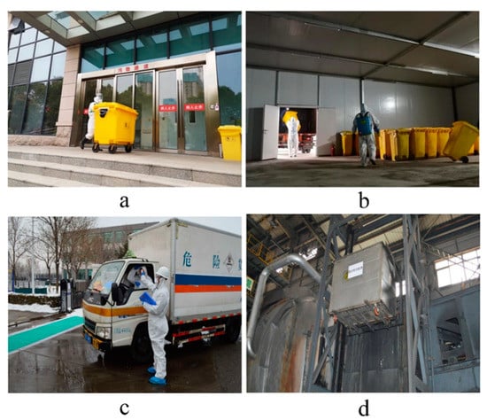 Operation mode of medical waste disposal: collection (a), storage (b), transportation (c), disposal (d). From [,,].