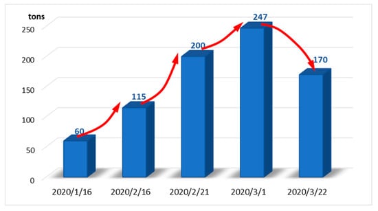 During the COVID-19 epidemic, the number of patients increased, and the output of medical waste surged []. The output of medical waste in Wuhan has risen from about 40 tons per day to a peak of 247 tons (Figure 6). The disposal pressure is huge. Once these medical wastes containing the new coronavirus cannot be disposed of in a timely and safe manner, the virus will flow into the public space with the items, endangering the health and safety of the people. According to data from the Chinese Ministry of Ecology and Environment, since 20 January, a total of 256,000 tons of medical waste have been disposed of nationwide. As of April 11, the national daily disposal capacity of medical waste was 6062.4 tons, an average daily increase of 1159.6 tons compared with 4902.8 tons before the epidemic. Among them, the daily treatment capacity of medical waste in Hubei Province has increased from 180 tons before the outbreak to 667.4 tons per day, and Wuhan city has increased from 50 tons before the outbreak to 265.6 tons per day. The rapid improvement of the daily treatment capacity of medical waste is largely due to the rapid response of the government and the active response of local and medical institutions.