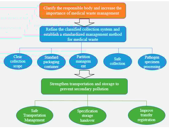 During the COVID-19 epidemic, the daily generation of China’s medical waste has increased significantly, placing a severe test on China’s medical waste disposal system. Faced with difficulties, the Chinese government has formulated a policy for medical waste management and a response plan for the epidemic, which provides policy guarantee for the standardized disposal of epidemic medical waste []. In addition, the government and medical institutions at all levels have formed a comprehensive, refined, and standardized medical treatment process system during research and practice. China has increased the capacity of medical waste disposal in various places by constructing new centralized disposal centers and adding mobile disposal facilities. Therefore, effective response measures across the country ensure the proper disposal of medical waste.