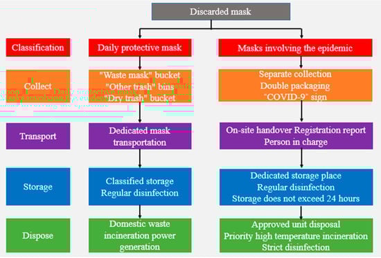 The medical waste of the COVID-19 epidemic is infectious medical waste. According to the “National List of Hazardous Wastes”, the waste category is HW01 medical waste, and the waste code is 831-001-01. During the epidemic, the reasonable disposal of medical waste has become an important link to prevent secondary pollution. In the research and practice of the government and medical institutions at all levels, a comprehensive, refined, and standardized medical treatment process system has been formed. Take the discarded mask as an example (Figure 8):