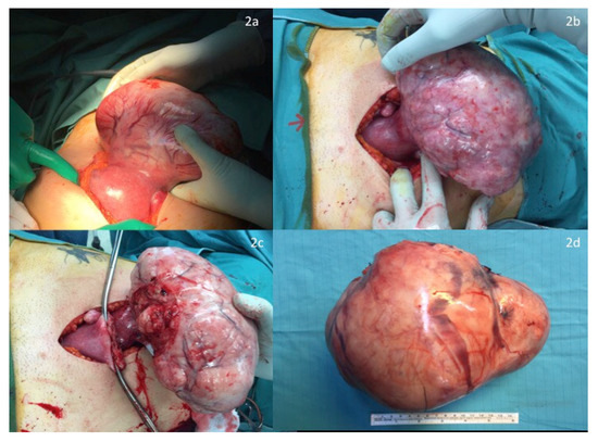 (a,b) Exteriorization of large mass after longitudinal laparotomy. (c,d) Surgical resection along the surface.