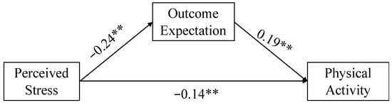 When people experience stress, their attention is directed to meeting stress-related needs []. They tend to overlook long-term benefits and make short-sighted decisions. However, considering the future outcomes of performing physical activity can motivate people to exercise [,]. Therefore, perceived stress may lead to reduced outcome expectancies, resulting in reduced physical activity.