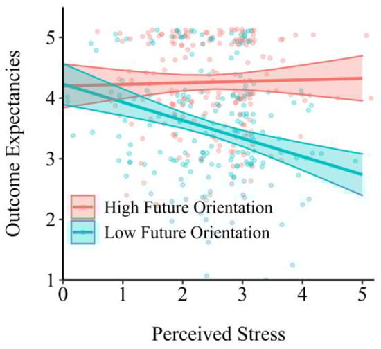 To examine the moderating effect of future orientation, we constructed a moderated mediation model. Our results showed that future orientation moderated the relationship between perceived stress and outcome expectancies (β = 0.24, s.e. = 0.07, p < 0.001). The simple slope analysis showed that the association between stress and outcome expectancies was significant for people with a low future orientation (β = −0.23, s.e. = 0.08, p = 0.002) but not for people with a high future orientation (β = −0.08, s.e. = 0.07, p = 0.249; Figure 3).