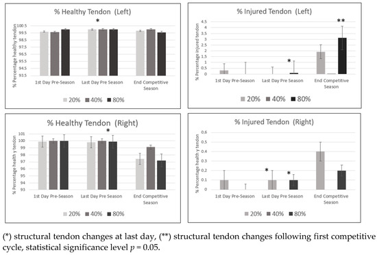 - Rabello, L.M.; van den Akker-Scheek, I.; Kuipers, I.F.; Diercks, R.L.; Brink, M.S.; Zwerver, J. Bilateral Changes in Tendon Structure of Patients Diagnosed with Unilateral Insertional or Midportion Achilles Tendinopathy or Patellar Tendinopathy. Knee Surgery Sports Traumatol. Arthrosc. 2020, 28, 1631–1638. [Google Scholar] [CrossRef] [Green Version]