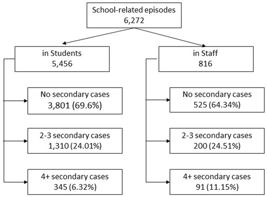 | Type of School | No Secondary Cases | Secondary Cases | 1 or 2 Secondary Cases | 3 or More Secondary Cases | Mean of Secondary Cases (SD) | Median of Secondary Cases (5p–95p) |
