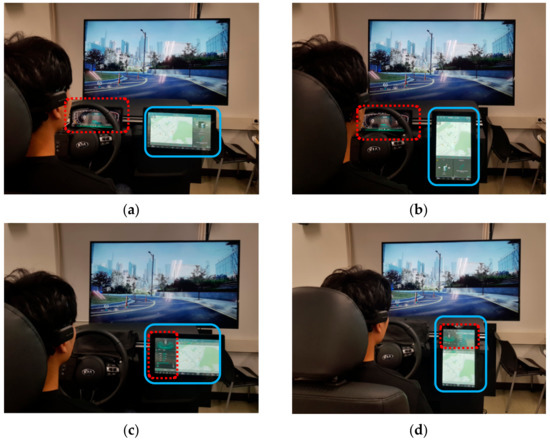 Four experimental settings based on the cluster location (front or right side) and the main axis of the display (horizontal or vertical) were designed, as shown in Figure 1. The displays of the cluster are shown as dotted red boxes and the right-side displays (centre fascia monitor) are shown as blue boxes. In Figure 1a,b, the clusters are displayed on the front display monitor behind the driver’s steering wheel and the right-side displays of the centre fascia monitor are horizontal (Figure 1a,c) or vertical (Figure 1b,d). In Figure 1c,d, the clusters are displayed on the centre fascia monitor as dotted red boxes. The detailed combinations of the displays are shown in Table 1.