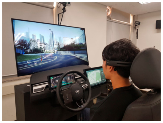 In this experiment, a driving simulator and two different sizes of monitors were used. The monitor sizes were 12.3” and 15.6”, and they were installed at the cluster and centre fascia locations, respectively. The EEG signal was measured using a multi-channel, wireless, portable Emotiv EPOC+ headset (Emotiv, San Francisco, CA, USA). Electrodes were placed according to the 10–10 system [29]. The locations of the electrodes were AF3, F7, F3, FC5, T7, P7, O1, O2, P8, T8, FC6, F4, F8, and AF4. EmotivPRO (version 2.0, Emotiv, San Francisco, CA, USA) software was used to analyse the EEG data. Raw EEG and performance-related psychophysiological indices were collected in real time at sampling rates of 128 and 2 Hz, respectively. Performance-related psychophysiological indices were analysed as built-in functions in the software using raw EEG signals.