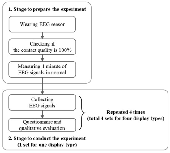 The order of this experiment was balanced based on the balanced Latin square method. EEG signals were collected while performing the task. At the end of the experiment on each display type, the questionnaire and qualitative evaluations were collected (Figure 3). The experiment lasted approximately 2 h. A rest time of 5 min was provided between the two conditions (Figure 3).