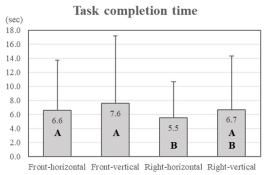 The task completion time was analysed according to the four display conditions. There was a statistically significant difference (p = 0.000; α = 0.05) between task completion times for the different display conditions. In Figure 4, the bar graphs show the means of the task completion times and error bars indicate standard deviations. The task completion time was the shortest for the right–horizontal display (5.5 ± 5.1 s) and longest for the front–vertical display (7.6 ± 9.6 s).